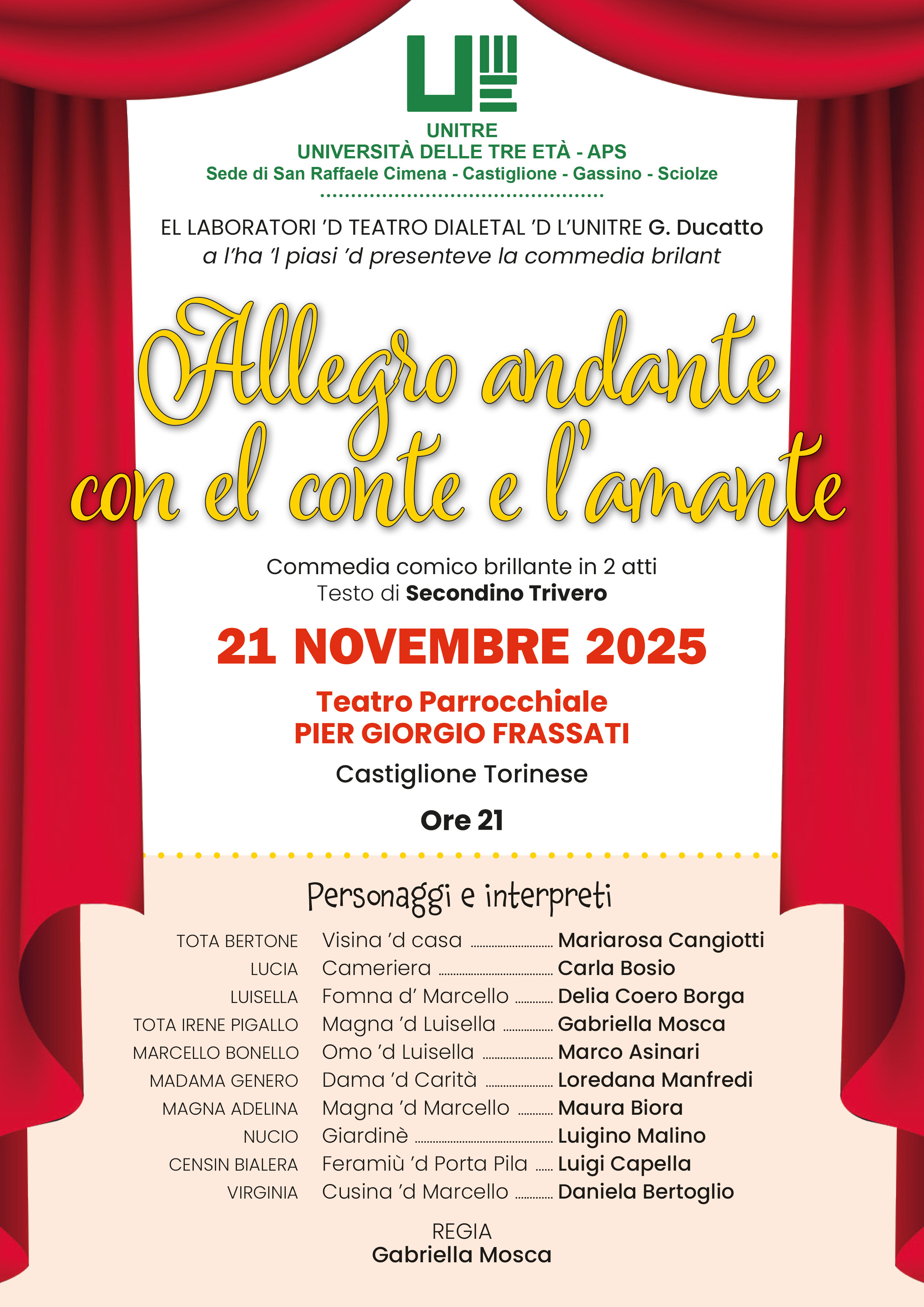 Nell'ambito della rassegna Autunno in scena 2025, promossa dal Comune di Castiglione, la commedia brillante scritta da Secondino Trivero, docente Unitre, non è interpretata dalla nostra Compagnia teatrale, ma diversi suoi componenti sono n...