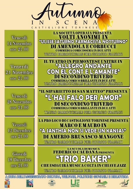 Il Comune di Castiglione rinnova il suo impegno per organizzare e promuovere cinque interessanti appuntamenti autunnali, che spaziano dalla musica jazz alla commedia d'autore nazionale, dal teatro in lingua piemontese allo spettacolo di variet&ag...